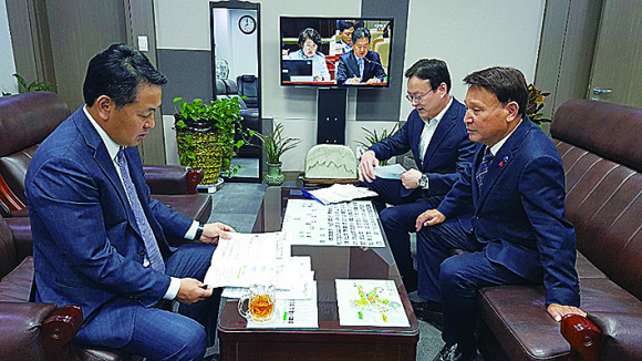 | 지난 3일 강임준 군산시장이 주요사업의 증액을 위해 예결위소소위 심의가 진행중인 국회를 방문해 지역구 김관영 국회의원과 김수흥 국회 사무차장을 만나 면담을 하는 모습이다. |