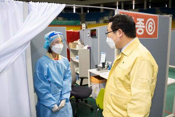정 시장은 29일 만 75세 이상 어르신들의 접종이 이뤄지고 있는 현장을 찾아 접수부터 백신 접종까지 단계별 절차를 점검하고 현장 의료진과 행정인력 등을 격려했다.