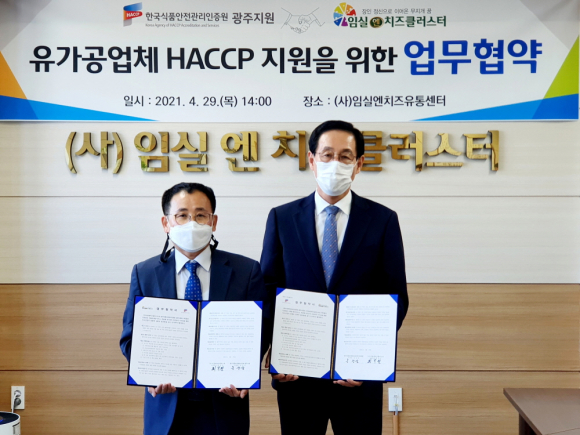 (사)임실엔치즈클러스터(이사장 임실군수 심민)와 한국식품안전관리인증원(원장 조기원, 이하 인증원) 광주지원은 지난 4월 29일 임실N치즈 유통센터에서 HACCP 지원을 위한 업무협약(MOU)을 맺었다.