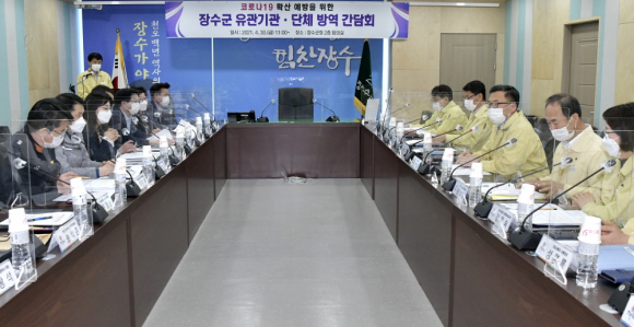 장수군은 30일 회의실에서 관내 코로나19 확진자 발생에 따른 지역사회 집단감염에 대한 주민 불안감 해소와 확산 예방 및 유관기관과의 협력을 통한 안전한 장수군을 구현하기 위한 유관기관・단체 방역간담회를 개최했다.