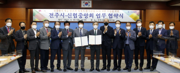 전주시와 신협중앙회는 30일 전주시장실에서 김승수 전주시장과 김윤식 신협중앙회장, 김선태 한국전통문화전당 원장 등 관계자가 참석한 가운데 전통한지 계승·발전과 세계적 한지산업도시 기반 조성을 위한 업무협약을 체결했다.