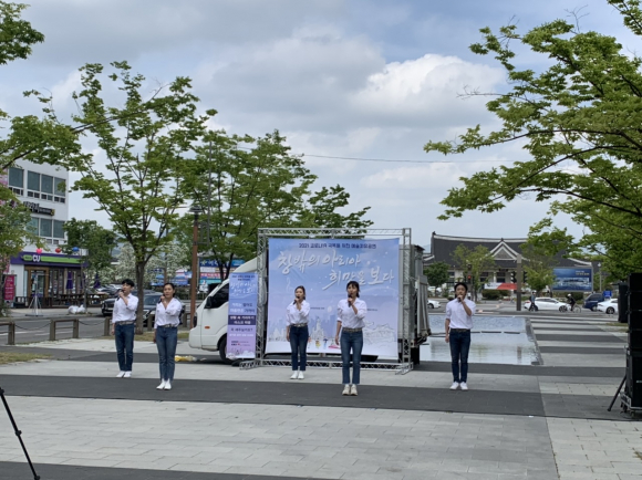 ‘창 밖의 아리아, 희망을 보다’ 치유공연은 시와 11개 예술단체가 의기투합해 병원, 직장, 다중이용시설 등 예술치유가 필요한 시설을 찾아가 공연을 펼치는 것으로, 공연자는 실외에서, 관객은 건물 내부에서 관람하는 비대면 방식으로 진행되는 게 특징이다.