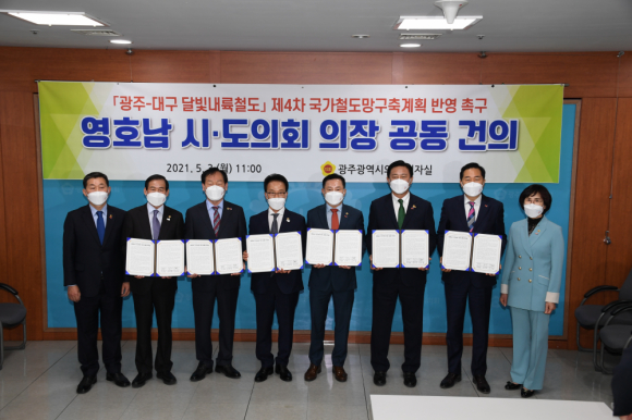 의장단은 "달빛내륙철도가 경유하게 될 대구·경북·경남·전북·전남·광주 6개 시·도의회는 영호남 시?도민과 함께 국가철도계획에 최종 반영될 수 있도록 모든 노력을 다하겠다"고 덧붙였다.
