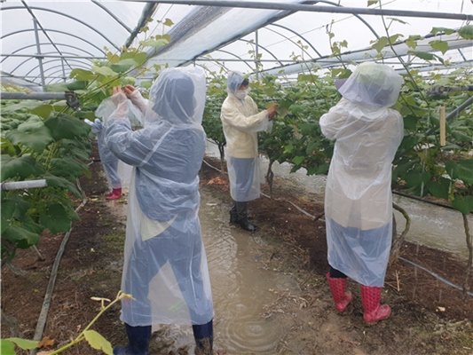 이른 아침부터 한마음으로 농가지원에 나선 직원들은 지난 주 딸기 꽃 따기 및 묵은 잎 제거에 이어서 백구면 유강리 강좌마을 김현일 농가의 포도 곁순 및 덩굴순 제거등 비가오는 날씨에도 불구하고 농촌 현장의 어려움을 몸소 체험했다.