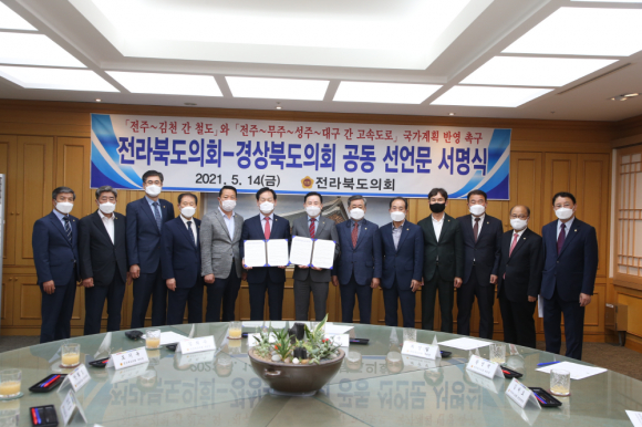 전북도의회 송지용 의장과 경상북도의회 고우현 의장 등은 14일 전북도의회에서 동서 화합을 상징하는 전주~김천 간 철도사업과 전주~무주~성주~대구 간 고속도로 건설사업의 국가계획 반영을 촉구했다.