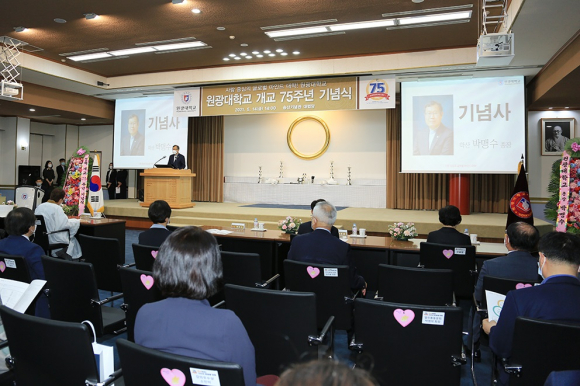 원광대학교(총장 박맹수)는 개교 75주년 기념식 및 원광 100년 개벽원광 발전기금 1천억원 조성 비전 선포식을 지난 14일 교내 숭산기념관 3층 대법당에서 개최했다.