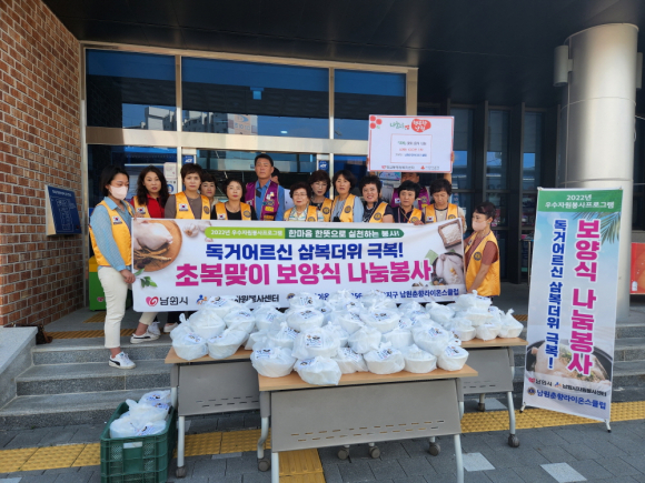 이번 행사는 남원시자원봉사센터 2022년 우수자원봉사 프로그램의 일환으로, 남원춘향라이온스클럽 회원들이 삼복더위에 지친 관내 취약계층 어르신들을 위해 삼계탕 100인분을 재료손질부터 상차림까지 준비하여 향교동행정복지센터에 식사장소를 마련했다.