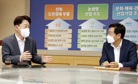 우범기 전북 전주시장은 15일 전북도청을 찾아 김관영 도지사를 마주하고 대한방직 부지개발과 완주·전주 통합 추진 등 민선8기 주요 현안에 대한 적극적인 관심과 지원을 요청했다.