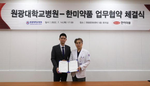 원광대학교병원(병원장 서일영)은 지난 14일 한미약품(대표이사 우종수)과 원광문화센터 5층 회의실에서 업무협약을 체결했다.