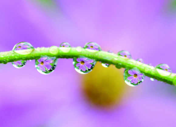 호박 덩굴위에 맺힌 아침이슬 속에 비춰진 코스모스