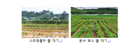이 때문에 가뭄으로 콩잎이 3일 이상 뒤집히는 현상이 발견되면 밭고랑에 물 흘려대기를 해 땅속으로 수분이 충분히 스며들도록 하고, 자동 물뿌리개(스프링클러)나 분수관(호스)을 이용해서 7~10일 간격으로 물주기를 해 준다.