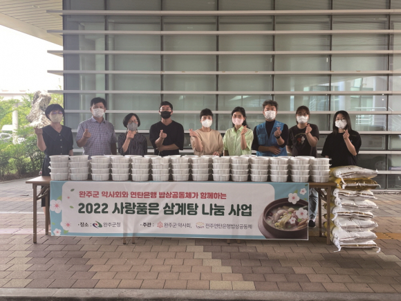 완주군약사회(회장 양미연)과 전주연탄은행(대표 윤국춘)이 초복을 맞아 취약계층을 위해 삼계탕과 백미를 전달했다. 18일 완주군은 최근 취약계층을 위해 완주군 약사회의 후원을 받아 전주연탄은행이 삼계탕을 직접 요리해 관내 저소득 어르신, 청소년, 아동들에게 전달했다고 밝혔다. 전달된 삼계탕은 총 230인분으로 백미와 함께 전달됐다. 양미연 회장는 “초복을 맞아 어려운 이웃들을 위해 이번 나눔을 준비하게 됐다”며 “맛있게 드시고 건강하게 여름을 나셨으면 좋겠다”고 전했다. 완주군 관계자는 “완주군에 꾸준히 따뜻한 관심을 가져주셔서 감사하다”며 “무더운 날씨, 정성스럽게 준비해주신 음식이 이웃들에게 큰 위로와 힘이 될 것 같다”고 말했다.