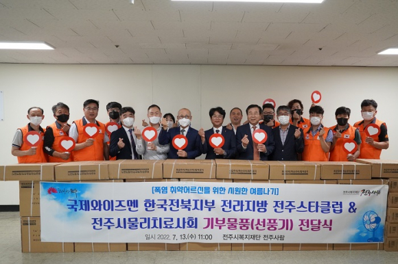 국제와이즈멘 한국전북지부 전라지방 전주스타클럽(회장 이기택)과 전주시 물리치료사회(회장 양영식)은 지난 13일 여름철 무더위에 취약한 어르신을 위한 선풍기(약 160만 원상당) 40대를 전주시복지재단 ‘전주사람’에 기부했다.