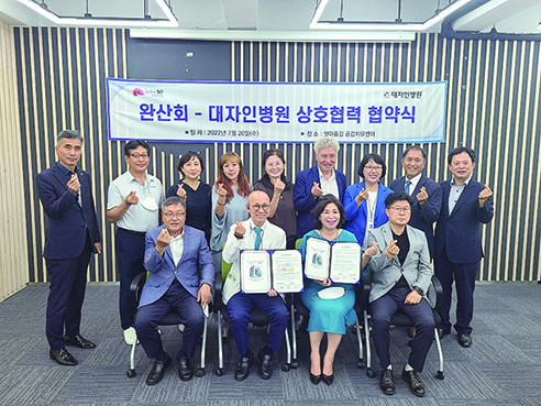 완산구 지역 내 유관기관 및 단체장 모임인 완산회(회장 이계순)와 대자인병원(병원장 이병관)이 20일 11시 첫마중길 공감치유센터에서 완산회 회원들의 건강서비스 증진을 위한 업무협약을 체결했다. 협약식에는 완산회 이계순 회장 및 김병수 완산구청장 등 완산회 회원과 대자인병원 이병관 원장을 비롯한 병원 관계자가 참석하는 가운데 진행됐다.