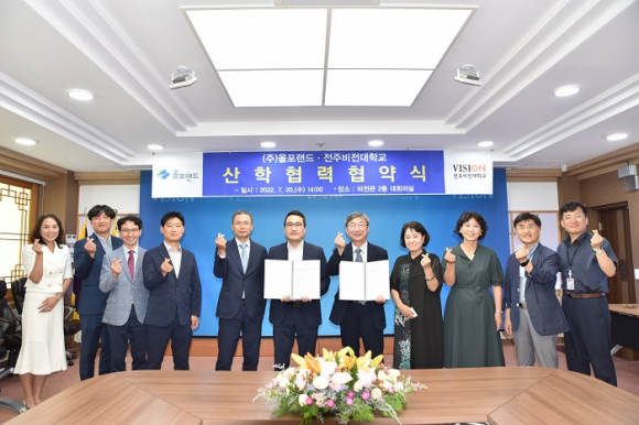 전주비전대학교(총장 정상모)는 20일 비전대 AI뉴테크실에서 ㈜올포랜드와 산학협력 협약을 체결했다.