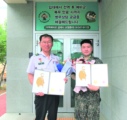 김제시의 한 도로에서 쓰러진 A씨(83)씨를 심폐소생술로 살린 육군 35사단 유중현 김제 교월동 예비군 동대장과 배민호 상병에게 대한적십자사 전북지사(회장 이선홍)가 표창을 수여했다.