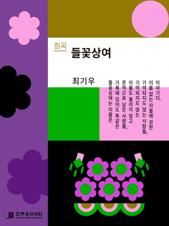 2021년에 공모를 통해 선정된 최기우 작가의 희곡작품을 오디오북으로 제작한 '들꽃상여'는 배우들이 연극을 준비하는 과정과 동학농민혁명 당시의 농민군들 이야기가 교차로 진행된다. 우리 지역의 역사이며, 한국사에서도 중요한 위치를 차지하는 동학과 동학농민군의 이야기를 한 편의 목소리극처럼, 라디오 드라마처럼 입체적으로 구현해 냈다.