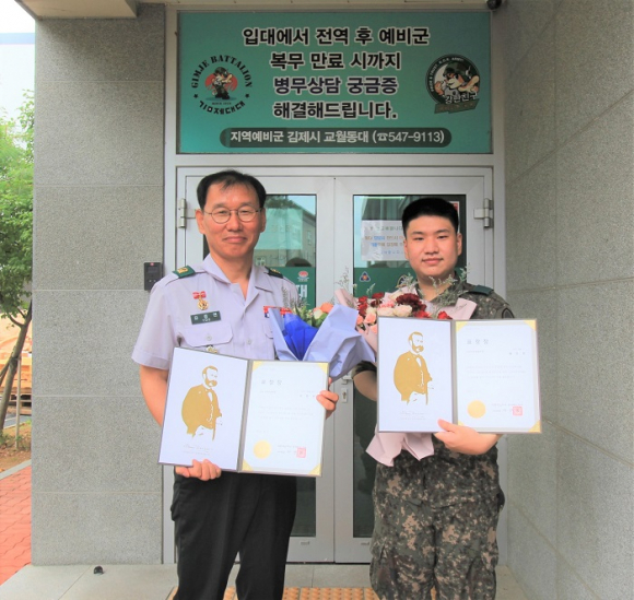 김제시의 한 도로에서 쓰러진 A씨(83)씨를 심폐소생술로 살린 육군 35사단 유중현 김제 교월동 예비군 동대장과 배민호 상병에게 대한적십자사 전북지사(회장 이선홍)가 표창을 수여했다.