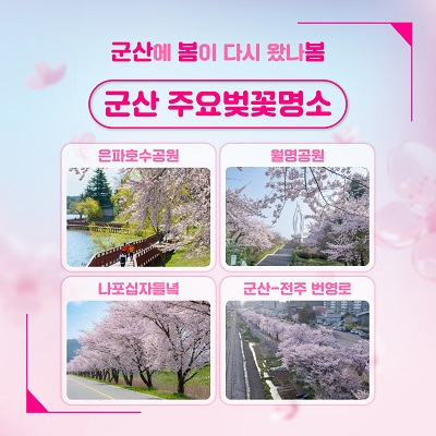 군산시가 추천하는 주요 벚꽃 명소는 반짝이는 호수 주변을 따라 화사한 벚꽃길을 자랑하는 은파호수공원, 50년 수령의 큼직한 벚나무들이 벚꽃 터널을 이루고 있는 월명공원, 일렁이는 핑크 꽃물결이 장관을 이루는 군산-전주 번영로(26번 국도), 한적한 시골 풍경과 함께벚꽃 드라이브를 즐길 수 있는 나포 십자 들녘까지 다른 매력을 가진 명소들이 곳곳에 위치 해있다.