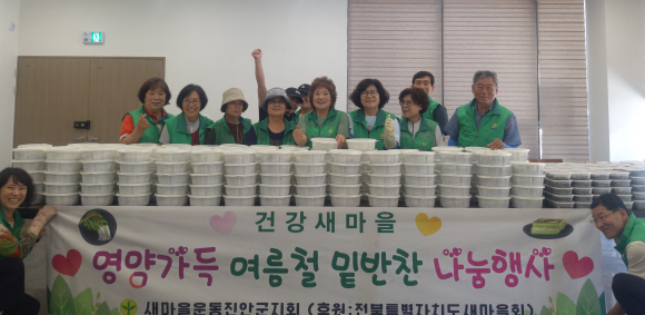 새마을운동진안군지회(지회장 김문옥, 협의회장 최영상, 부녀회장 이정자, 문고회장 김장섭)는 1일 진안군 용담면 용담솟을커뮤니티센터에서 새마을운동회원 20여명이 참여한 가운데 영양 가득한 여름철 밑반찬 나눔 행사를 진행했다.