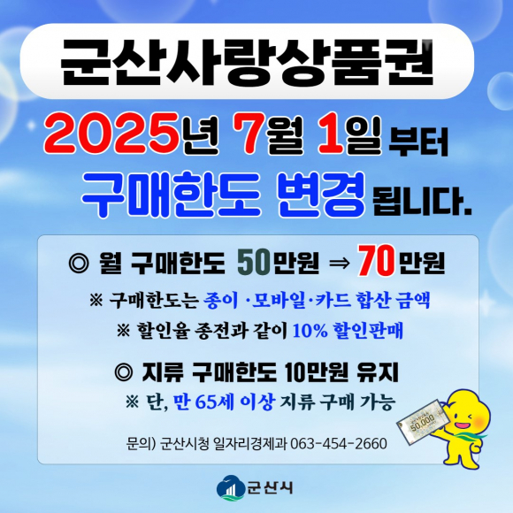 군산시가 7월부터 군산사랑상품권의 월 구매 한도를 기존 50만 원에서 70만 원으로 확대 운영한다. 이번 결정은 침체된 지역경제를 활성화하고 소상공인들의 매출 회복을 지원하기 위해서 마련됐다.