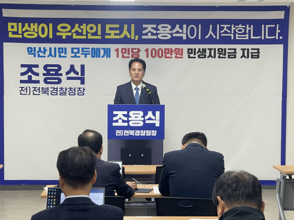 전북경찰청장을 역임한 조 출마예정자는 12일 익산시청 브리핑룸에서 기자회견을 열고“내년 6월 지방선거에서 민주당 간판을 내걸고 익산시장에 당선되면, 시 조례를 제정하고 시의회 예산 의결을 통해 임기 4년 동안 전 시민에게 1인당 100만 원의 민생지원금 지급 하겠다”고 약속했다.
