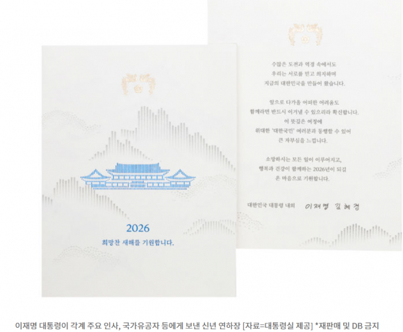 이 대통령은 26일 공개된 신년 연하장에서 "수많은 도전과 역경 속에서도 우리는 서로를 믿고 의지하며 지금의 대한민국을 만들어 왔다"며 "앞으로 다가올 어떠한 어려움도 함께라면 반드시 이겨낼 수 있으리라 확신한다"고 했다.