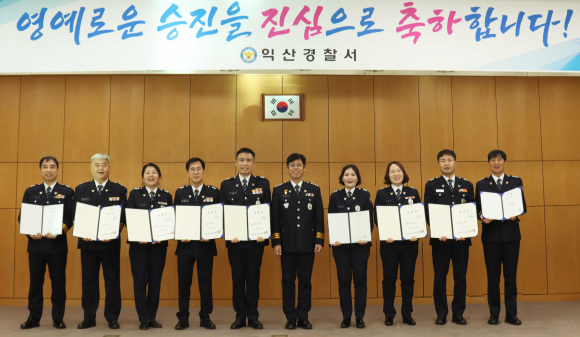 익산경찰서(서장 정창훈)는 31일 경찰서 5층 대동마루에서 범죄예방질서계 경위 김중섭 등 18명에 대한 승진임용식을 개최했다.