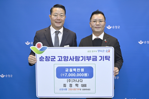 순창군은 5일 (주)가나다의 최정학 대표가 순창군에 고향사랑기부금 700만원을 기탁했다고 밝혔다.
