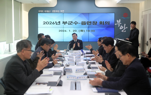 부안군은 20일 군청 3층 중회의실에서 정화영 부군수 주재로 2026년 부군수-읍·면장 회의를 개최하고 2025년 주요 성과와 2026년 군정 운영방향을 공유하며 읍·면 현안에 대한 사전 점검에 나섰다고 밝혔다.