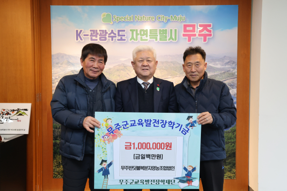 무주반딧불복분자영농조합법인은 지난 26일 (재) 무주군교육발전장학재단에 장학금 1백만 원을 기탁했다.