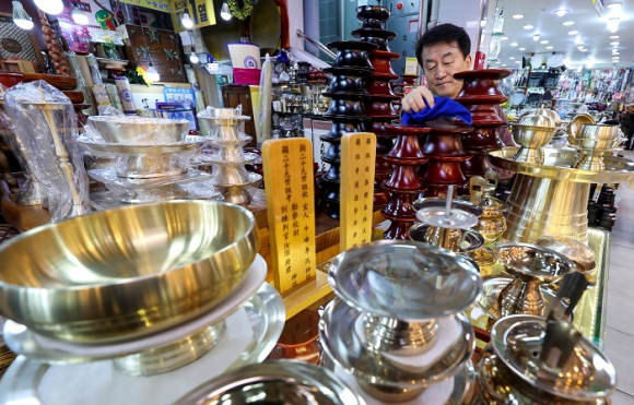 설 명절을 앞둔 5일 전통시장에서 한 상인이 명절 차례용 제기 세트를 진열하고 있다.