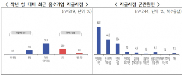 10일 중소기업중앙회에 따르면 819개 중소기업을 대상으로 실시한 '2026년 중소기업 설 자금 수요조사' 결과, 작년 설 대비 자금 사정이 ‘곤란하다’는 응답이 29.8%로 나타났다. 이는 ‘원활하다’는 응답(19.9%)을 크게 웃도는 수치다.