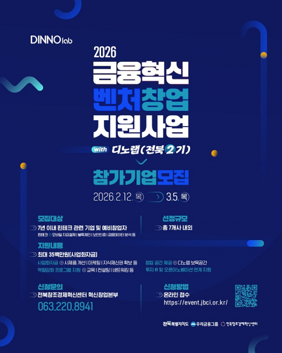 전북특별자치도와 전북창조경제혁신센터는 우리금융그룹 디노랩(DINNO Lab)과 협력해 ‘2026년 금융혁신 벤처창업 지원사업 with 디노랩(전북 2기)’ 참여기업을 모집한다고 12일 밝혔다. 지역 기반 금융혁신 생태계 조성과 유망 핀테크 기업 유치를 위한 조치다.