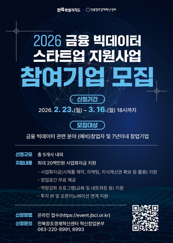 전북창조경제혁신센터가 2026년 ‘금융 빅데이터 스타트업 지원사업’ 참여기업을 모집한다고 23일 밝혔다. 금융 데이터 기반 혁신 서비스와 기술을 보유한 예비창업자와 기업을 육성하기 위한 사업이다.