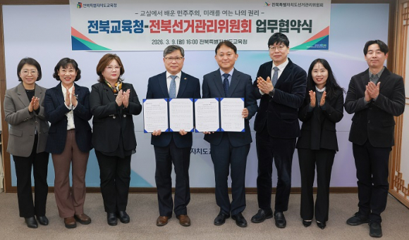 전북교육청은 9일 도교육청 5층 회의실에서 전북선관위와 ‘주권자 시민교육 활성화를 위한 업무협약’을 체결했다고 밝혔다. 협약식에는 유정기 교육감 권한대행과 경범훈 전북선관위 사무처장을 비롯해 양 기관 관계자 10여 명이 참석했다.