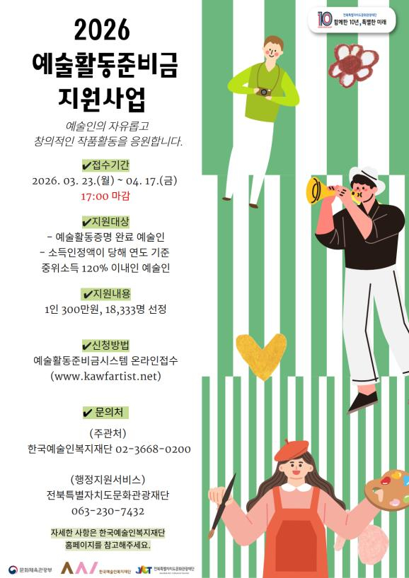 전북특별자치도문화관광재단은 ‘2026 예술활동준비금 지원사업’ 신청 편의를 위해 전북예술인복지증진센터에서 방문 행정지원서비스를 운영한다고 밝혔다.