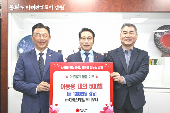 남원시(시장 최경식)는 지난 25일 프리미엄 실내복 브랜드 ‘무냐무냐’로 유명한 ㈜지비스타일(대표이사 박용주)로부터 관내 취약계층 아동들을 위한 아동용 내의 500벌(1,300만 원 상당)을 기탁받았다고 밝혔다.