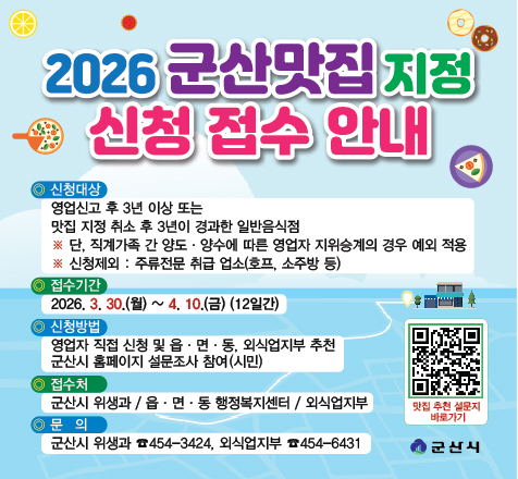 군산시는 지역 대표 음식점을 발굴해 관광산업을 활성화하고 지역경제 발전을 도모하기 위해 ‘군산맛집’ 선정 대상 업소를 모집한다고 밝혔다.