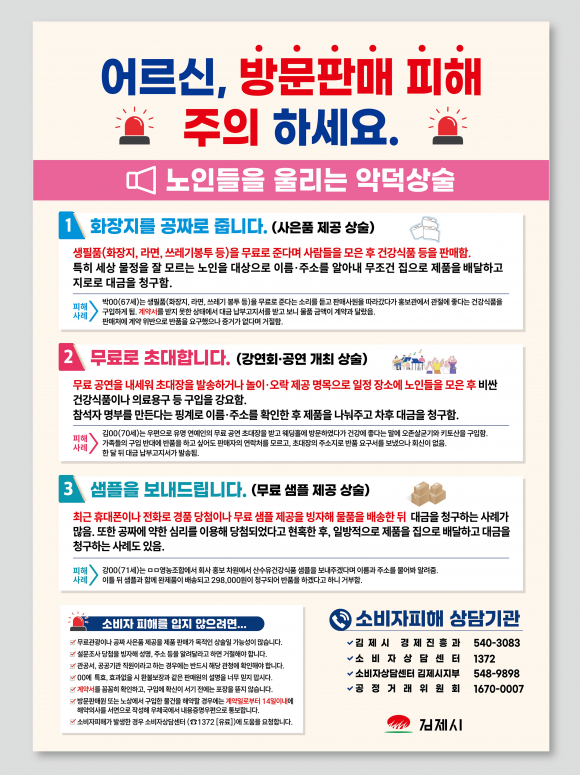 시는 피해를 최소화하기 위해 방문판매 피해예방 포스터를 제작배포하고 관공서 및 김제시 전체 마을 경로당 등에 게시하는 등 적극적인 홍보활동을 펼쳤다. 또한, 소비자상담센터 김제시지부와 협력체계를 구축해 업체에 대한 현장 계도와 예방 중심의 지도·점검 및 단속을 병행 추진하고 있다.