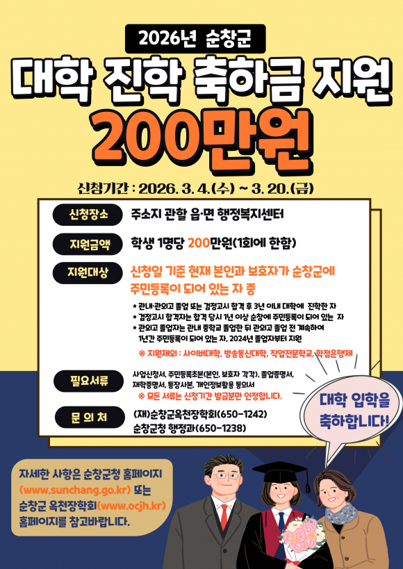 순창군은 (재)순창군옥천장학회에서 대학 신입생에게 1인당 200만원씩 ‘대학 진학 축하금’을 지급했다고 15일 밝혔다.